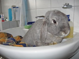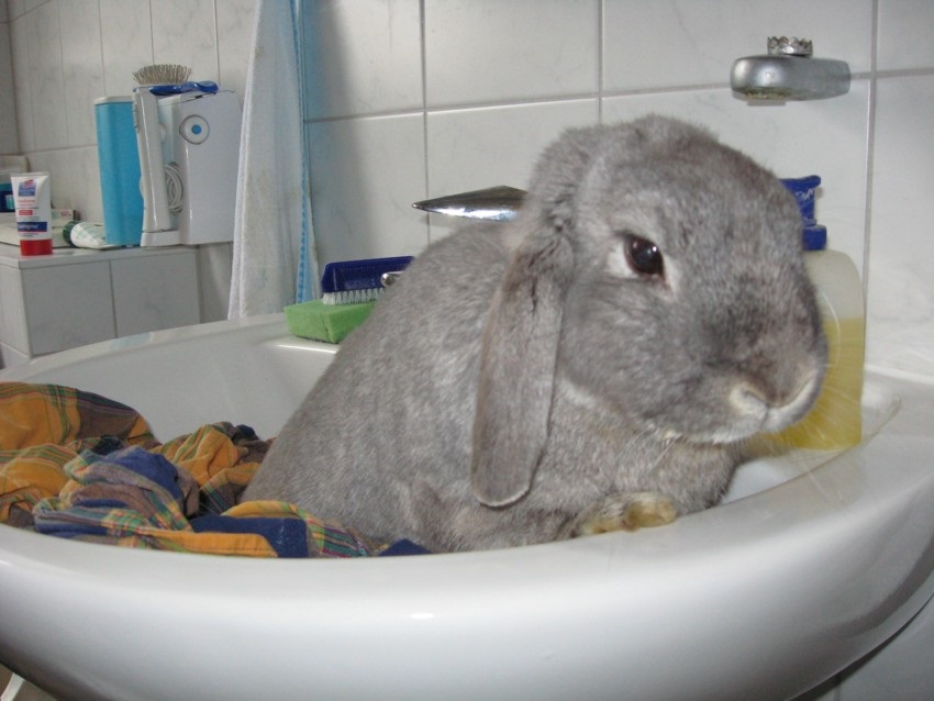 Sollte das Bad unumgänglich sein, können kleine Kaninchen dazu ins Waschbecken gesetzt werden; sollten Sie jedoch über keinerlei Erfahrung verfügen, setzen Sie das Tier sicherheitshalber besser in eine am Boden stehende Schüssel – auch sehr ruhige Charaktere sind mitunter erstaunlich fluchtbereit, wenn es darum geht, dem Wasser zu entkommen, und bei einem Sprung aus dem Waschbecken auf die Badfliesen sind schwere Verletzungen vorprogrammiert.