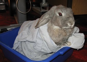 - 3. Umfassen Sie mit der rechten Hand den Brustkorb des Kaninchens und lassen Sie es dabei auf Ihrer linken Hand "sitzen" wie ein Baby, indem Sie seinen Rücken gegen Ihren Oberkörper lehnen.