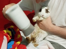 - 3. Wenn das Kaninchen nicht zu gestresst reagiert, kann es behutsam geföhnt werden. Kontrollieren Sie ständig mithilfe der angehaltenen Hand, ob auch keine zu heiße Luft aufs Fell trifft.