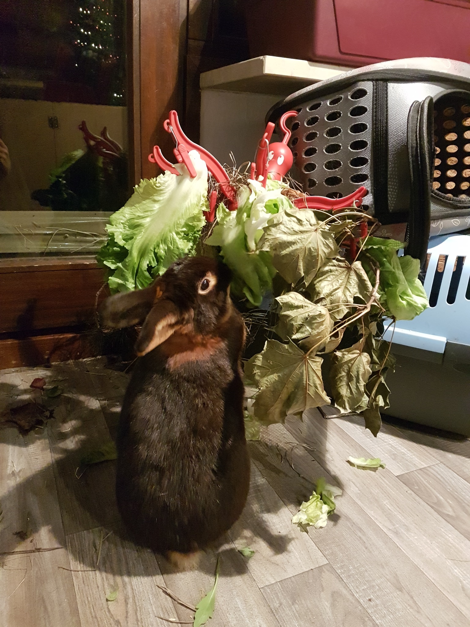 Eine quer gespannte Schnur oder Wäscheleine, an die verschiedene Zweige, Blätter und Kräuter geklammert werden: Eine solche "Kette" wird an zwei erhöhten Punkten befestigt, damit die Kaninchen sich ihr Futter durch Männchenmachen "erarbeiten" müssen.