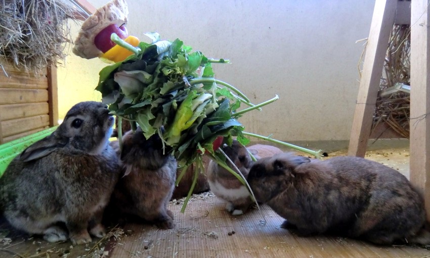 Kleine Mengen (!) Obst- und Gemüsestückchen auf einen spitzen Stock oder Metallstab gespießt, erhöht aufgehängt oder senkrecht in den Boden gesteckt, veranlassen die Kaninchen zu einer intensiven “Erarbeitung” ihres Futters.