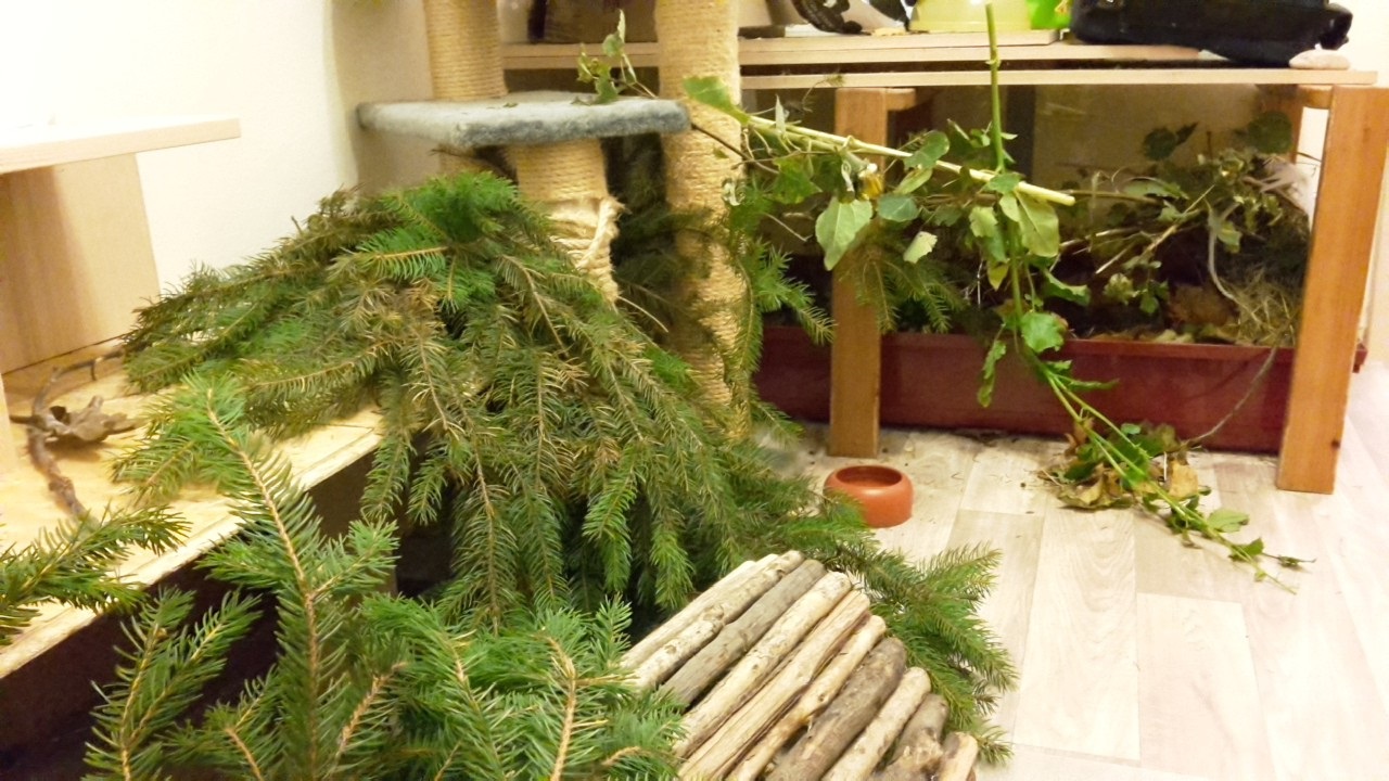 Frische Zweige sind nicht nur sehr gesund und befriedigen auf natürliche Weise das Nagedürfnis, sondern sie stecken auch voller interessanter Gerüche und bilden, wenn sie gebündelt aufgestellt oder über einen Unterstand gehängt werden, sehr beliebte Höhlen. Im Sommer kommen diverse Laubbäume in Frage, im Winter sind Tannen-, Kiefer- und Fichtenzweige ideal.