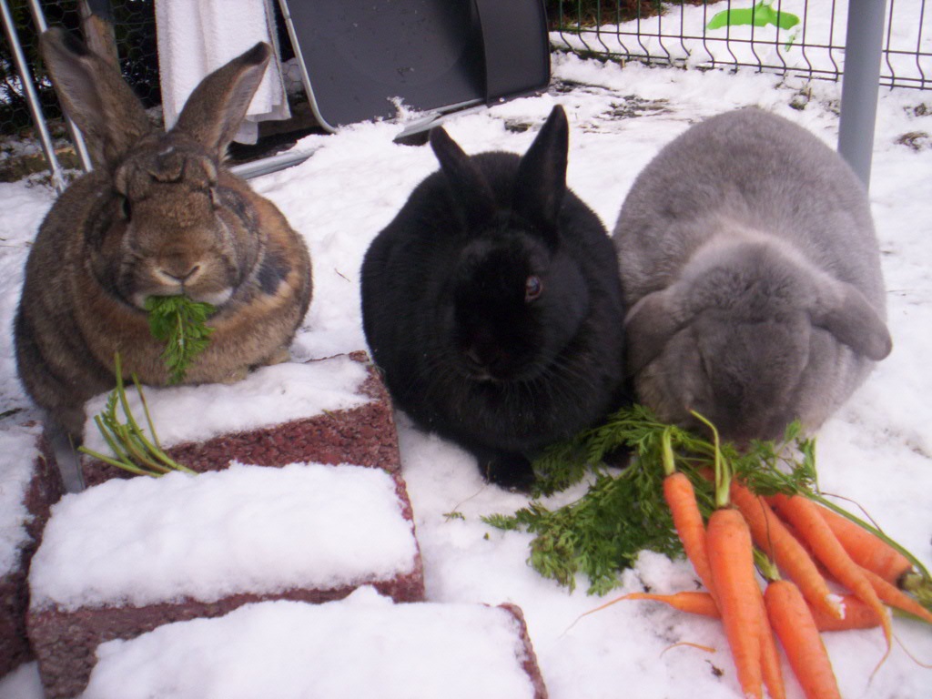 • Normalgewichtige Kaninchen in Winteraußenhaltung sowie untergewichtige Kaninchen dürfen täglich etwas bekommen. Allerdings müssen auch diese Tiere weiterhin größtenteils rohfaserhaltige Nahrung fressen. Mischen Sie das Wurzelgemüse daher am besten in kleinen Raspeln oder Scheiben unter das Grünfutter.