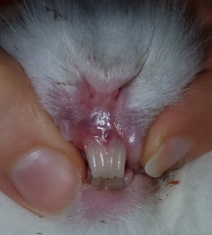 Die Schneidezahnkronen des Oberkiefers sind beim Kaninchen in etwa so lang wie die des Unterkiefers. Von der Seite betrachtet sollten die Schneidezähne des Oberkiefers in etwa bis auf die Höhe des Gaumens wachsen. Wenn Sie die Zähne Ihrer Kaninchen regelmäßig kontrollieren, werden Ihnen eventuelle Abweichungen auffallen. Im Zweifelsfall können Sie Fotos anfertigen, um einen Vergleich zu haben. Gerade für Anfänger in der Kaninchenhaltung ist dies sehr praktisch.